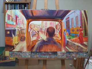 Worked on the interior of the rickshaw although I will probably make it relatively simple in the finished painting. I decided that the walls on the right should be in the shade with the figures in the saris picked out against them by being in sunlight. I also worked a bit on the nearest rickshaw on the left. I don't want it to look too neat and ordered as I want to get across something of the chaos of an Indian street.