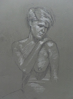 In lieu of any more progress on Dewi Sri until I get back to the studio on Saturday, here are a couple of life drawings from last night's session at the Sussex County Arts Club. The model was the lovely Naomi Wood who I did mainly portraits of during the course of the evening. They don't do her justice of course. Pastel pencil on Murano paper.