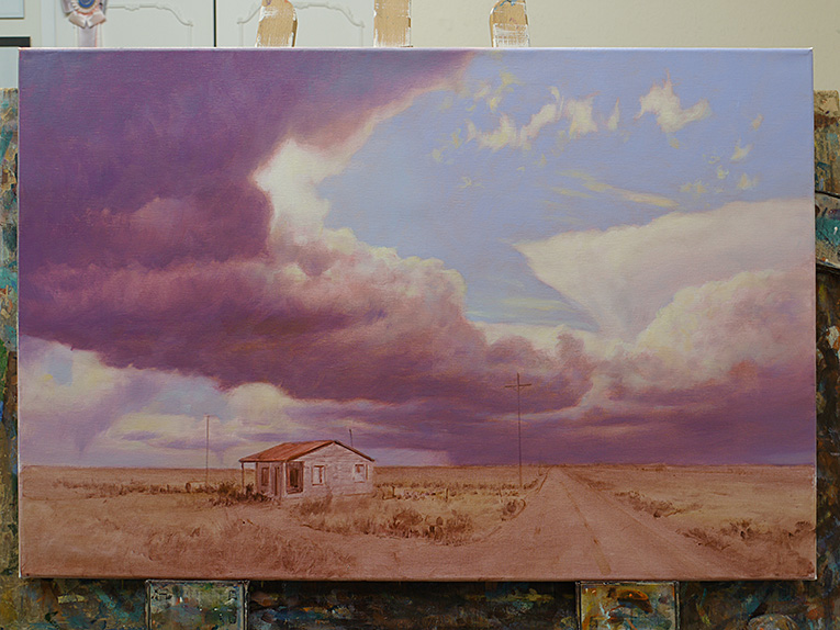 I have actually painted this location before when I titled it "Idalou" as it is near the small town called Idalou in Texas but I was never happy with it (even though I wrote an article about it for Artists & Illustrators magazine at the time) and am happy to return to it for a better stab at it now that I have improved my skies since then. I want to try and get across the loneliness of this little house amidst the vast space of the Texan landscape. To this end I am going to set it against a brooding stormy sky with the house and landscape picking up some low sunshine against the darkness behind. As a change from the earlier two paintings I'm seeing this one as relatively monochromatic in brown/violets and pinks and oranges but will not be painted in the way I was doing the monochromes earlier in the year.
